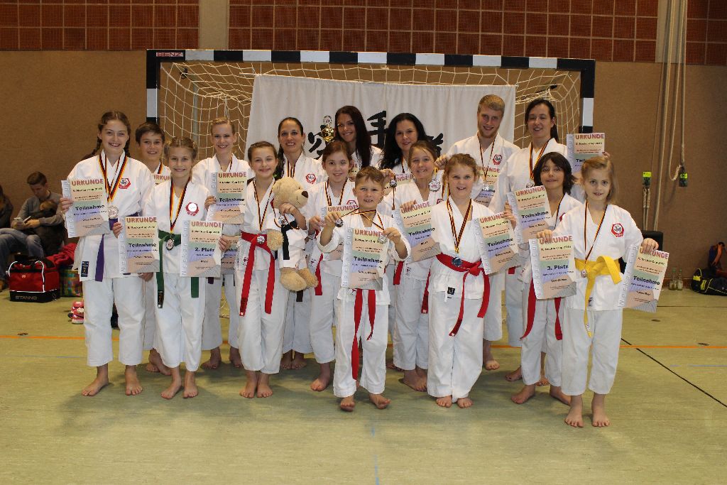 Im Kata-Teamwettbewerb der fortgeschrittenen Karateka, ein Mix aus Kindern und Erwachsenen, konnte sich das Team mit Angelina Mast (12 Jahre), Susann Hensel (10 Jahre) und Jannik Hensel (12 Jahre) sehr gut behaupten und erkämpften sich den 2. Platz.