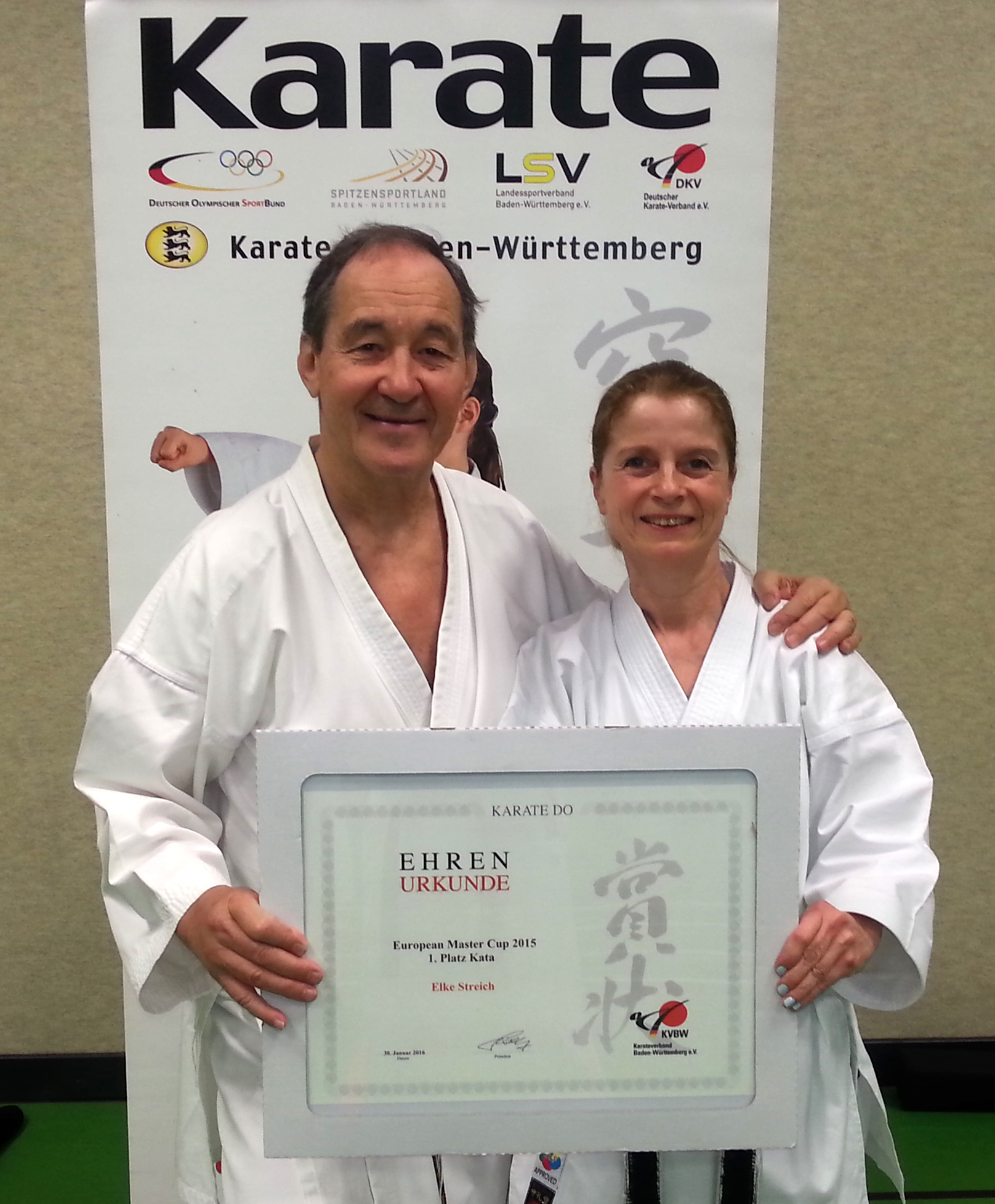 Im Rahmen des ersten Trainings werden auch immer die Karateka, welche sich im Vorjahr durch in Engagement um den Verband verdient gemacht haben, geehrt. Unter dem Applaus der 300 Teilnehmer, nahm Elke Streich vom Karate-Centrum Baden-Baden die Ehrenurkunde des Karate Verband Baden-Württemberg für besondere Leistungen im Karate entgegen. Geehrt wurde hiermit der 1.Platz Kata bei der Landesmeisterschaft Baden-Württemberg, der 2.Platz Kata auf der Deutschen Meisterschaft des DKV und der 1.Platz Kata bei den Europameisterschaften WKF 2015 in Nizza.